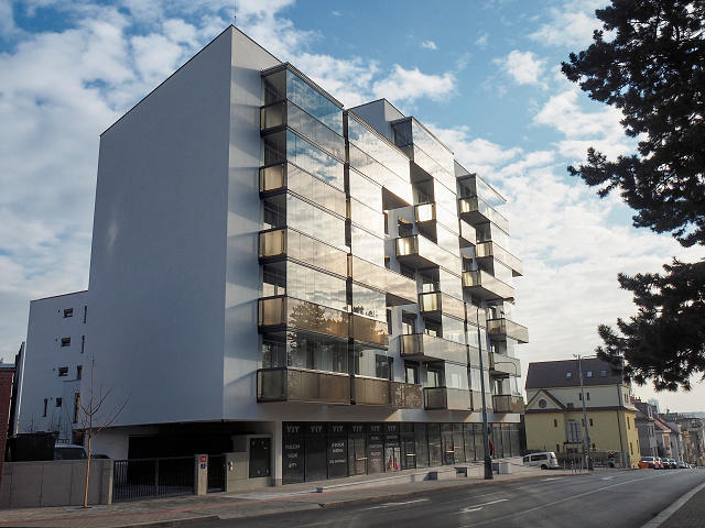 Architektonický styl projektu vychází ze severské estetiky s čistými liniemi, polozapuštěnými balkony a vnitřním patiem zeleně. hinton.cz